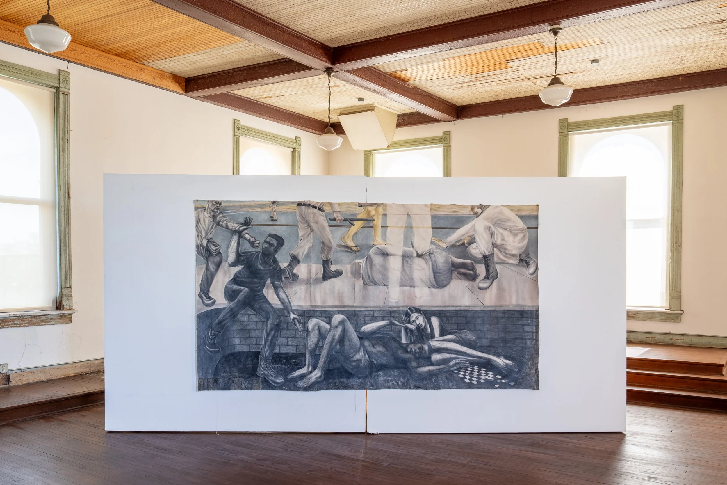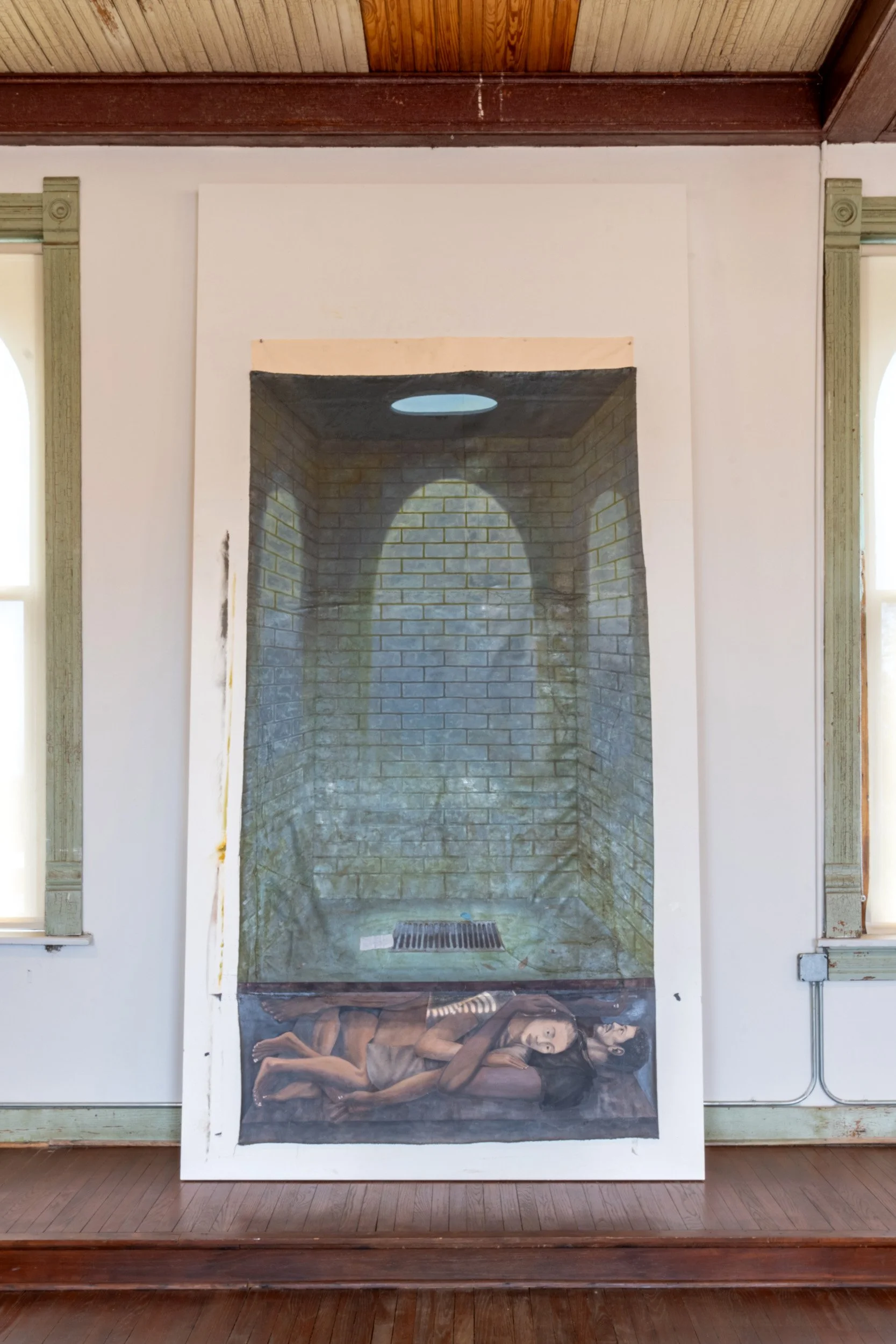 Erick developed a series of paintings conceived in direct response to the site, constructing compositions that extend and contract across the room. He made several life-size rubbings of the studio windows, using their imprint to define the space for some of the works. Continuing an ongoing investigation into symbolic topographies—an underground, middle ground, and sense of an “above”—the paintings register a sustained tension between presence and erasure, reflecting the convergence of layered histories and the charged calm of a place shaped by what once passed through it.