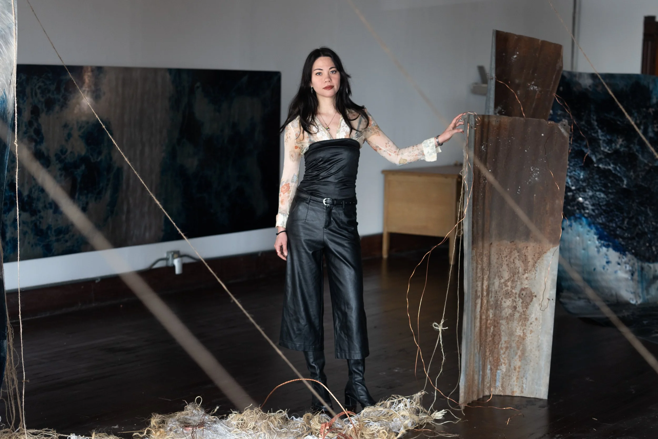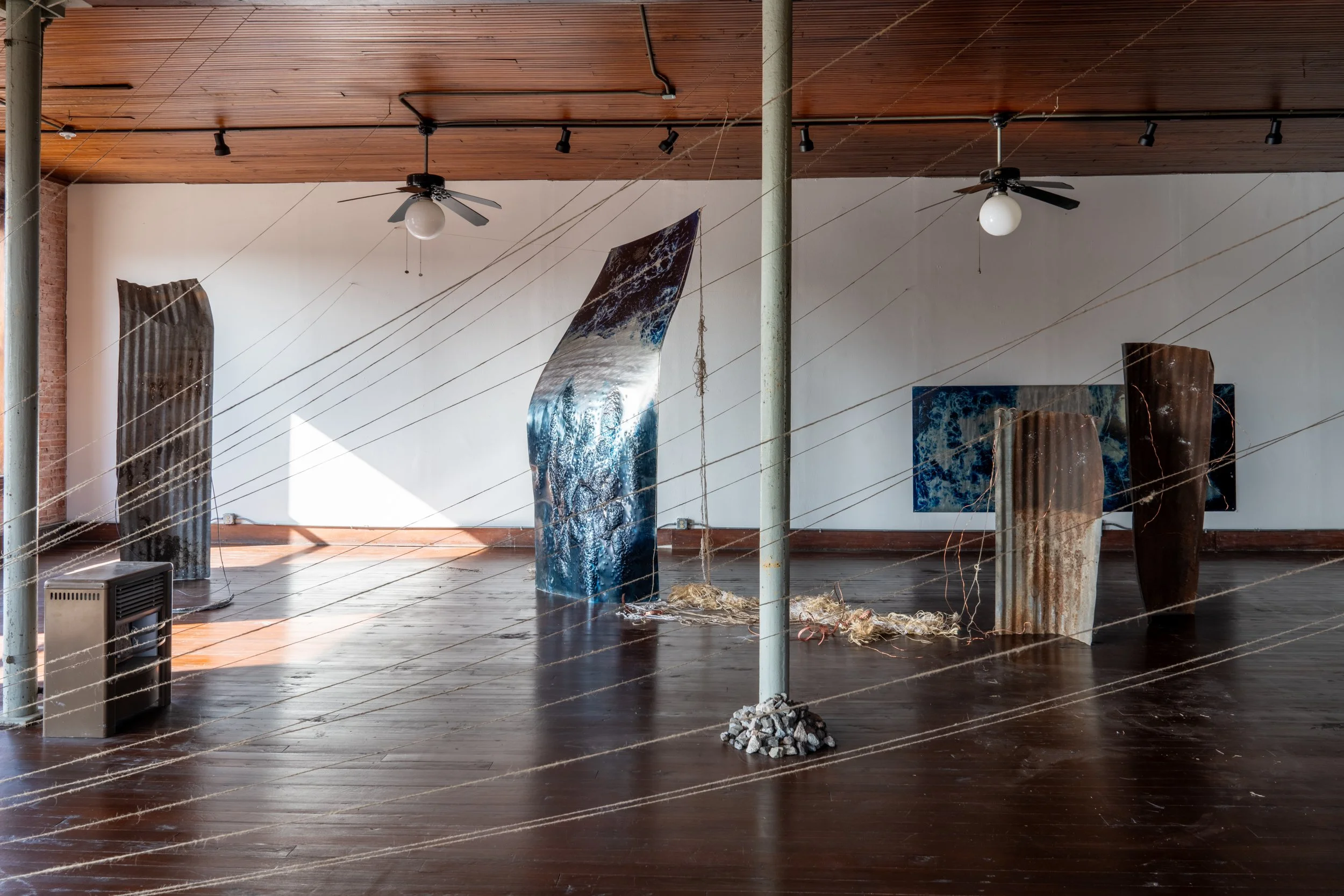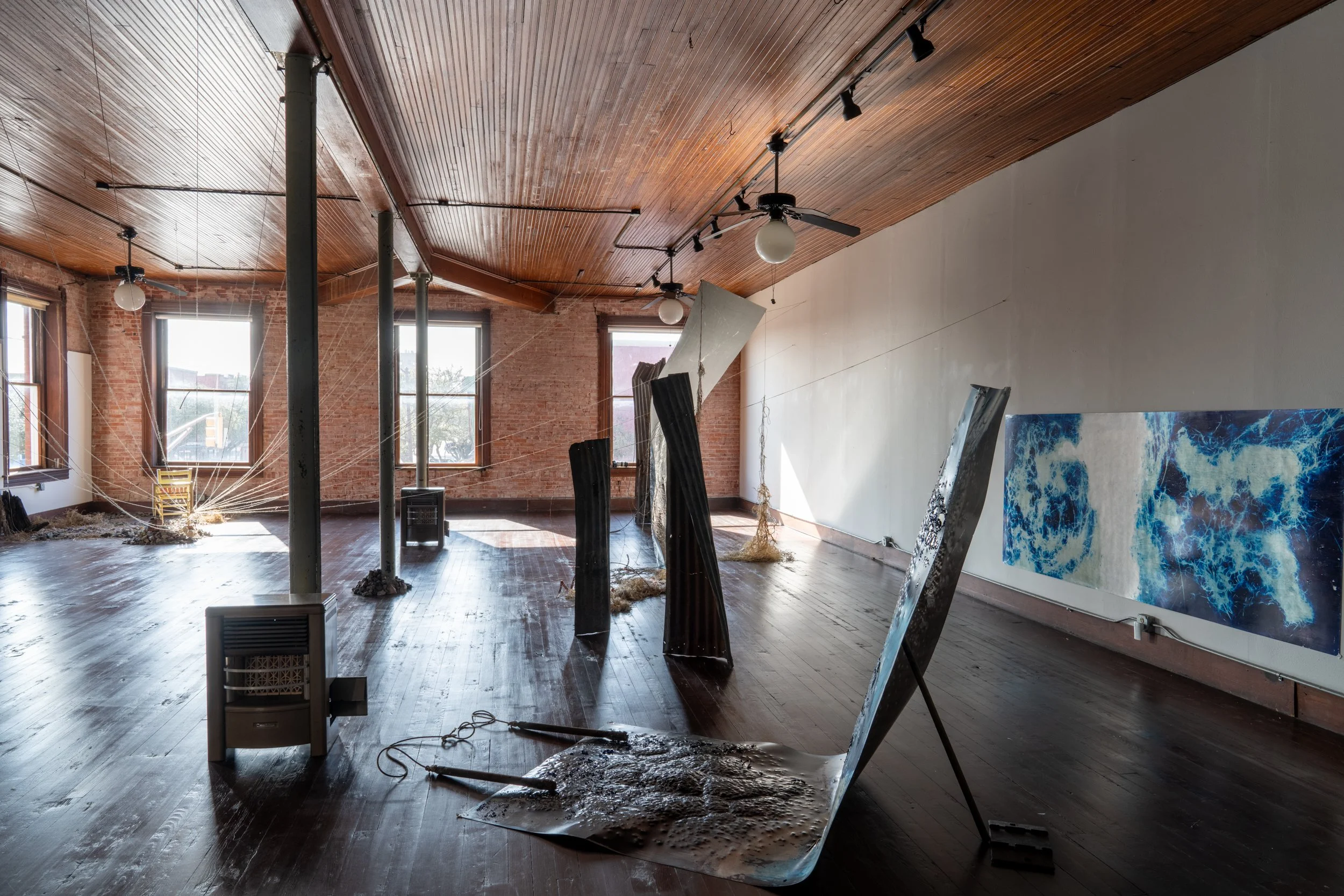 Kaja created a site-specific, immersive installation that transforms the studio into a tense, dreamlike landscape featuring suspended cyanotype photograms made from on-site materials. Drawing on Corsicana’s layered geology, oil history, and rhythms of perpetual motion—trains passing, weather shifting—the work allows viewers to assemble a narrative from fragments of matter, movement, and memory that speak to geological and industrial afterlives.